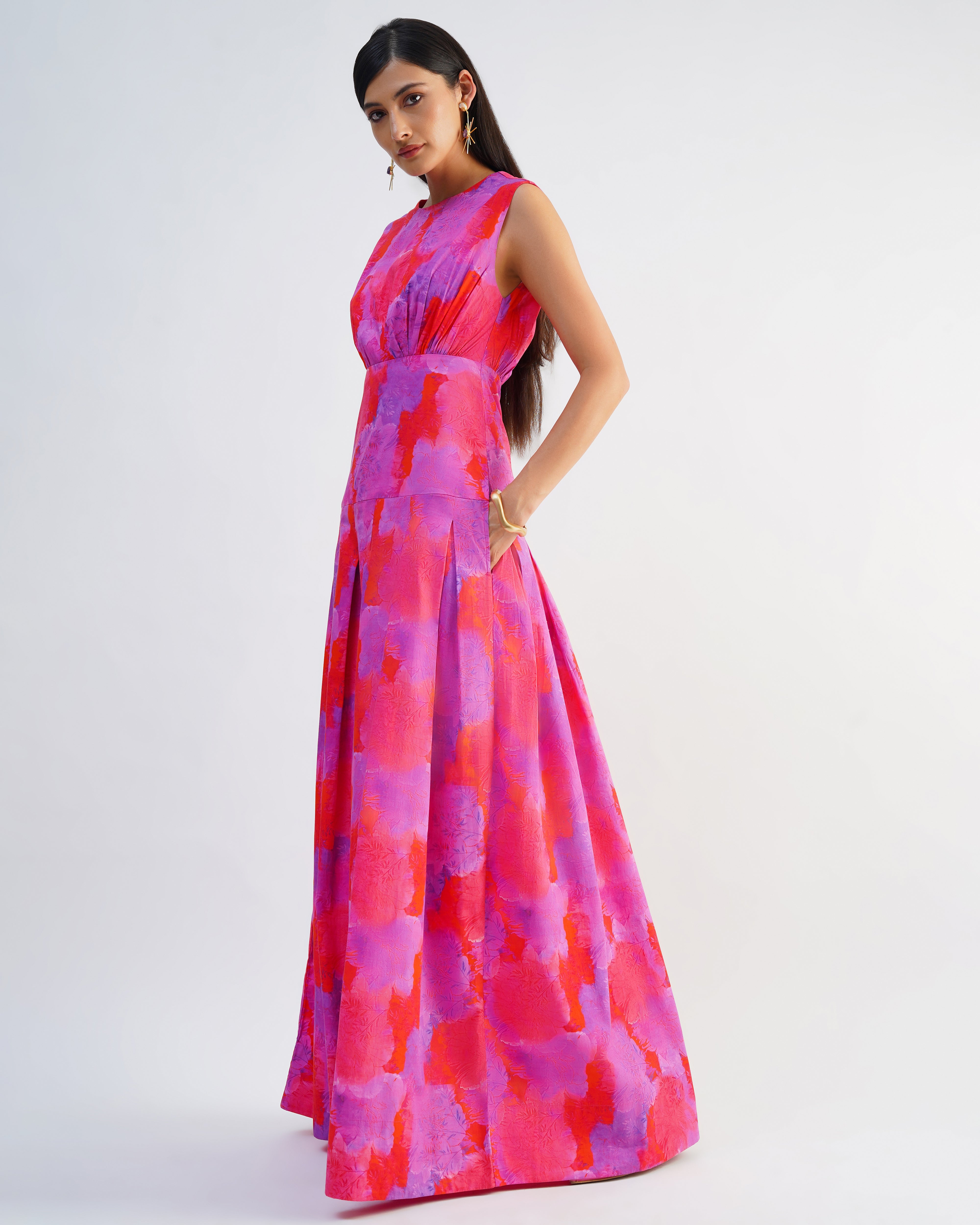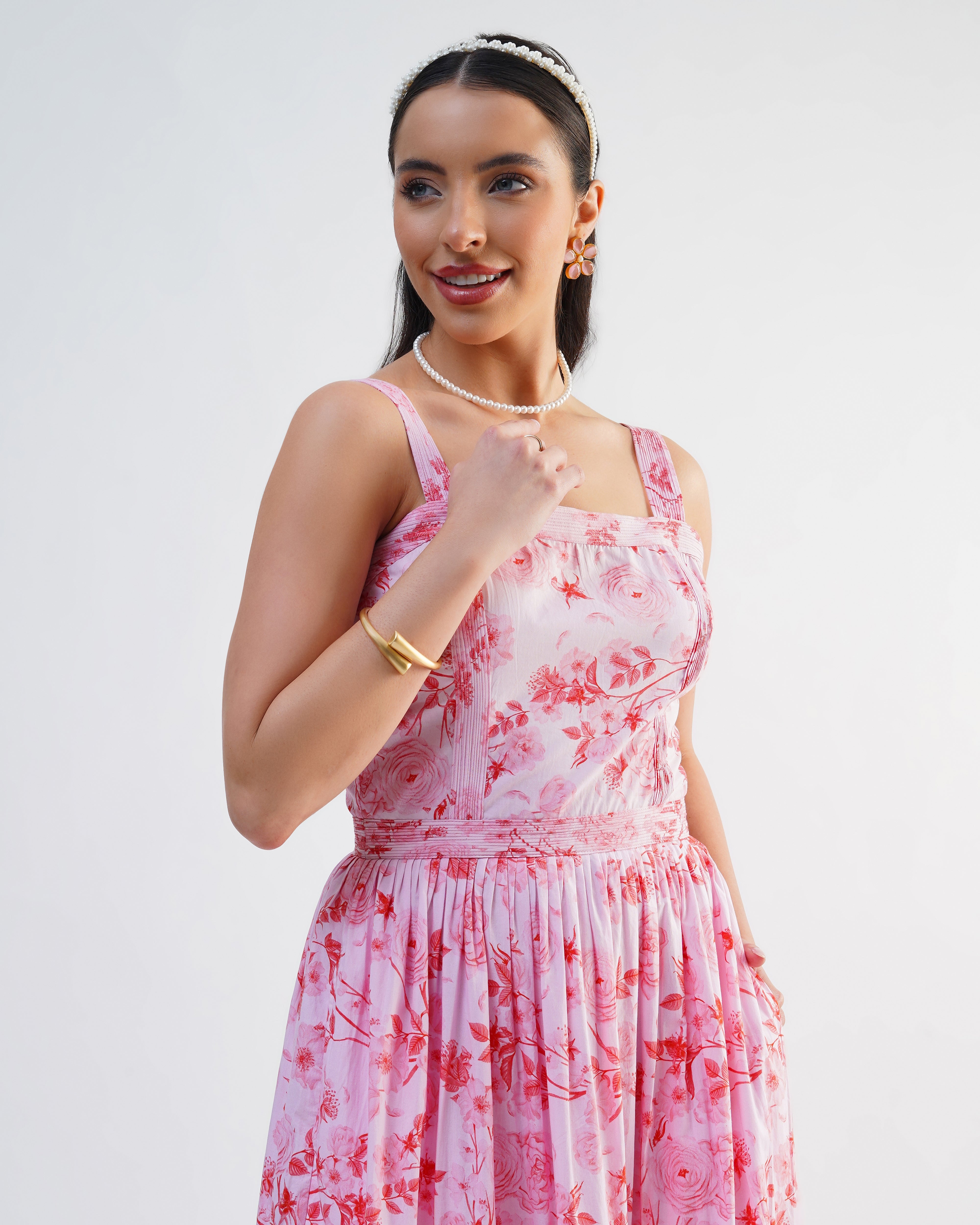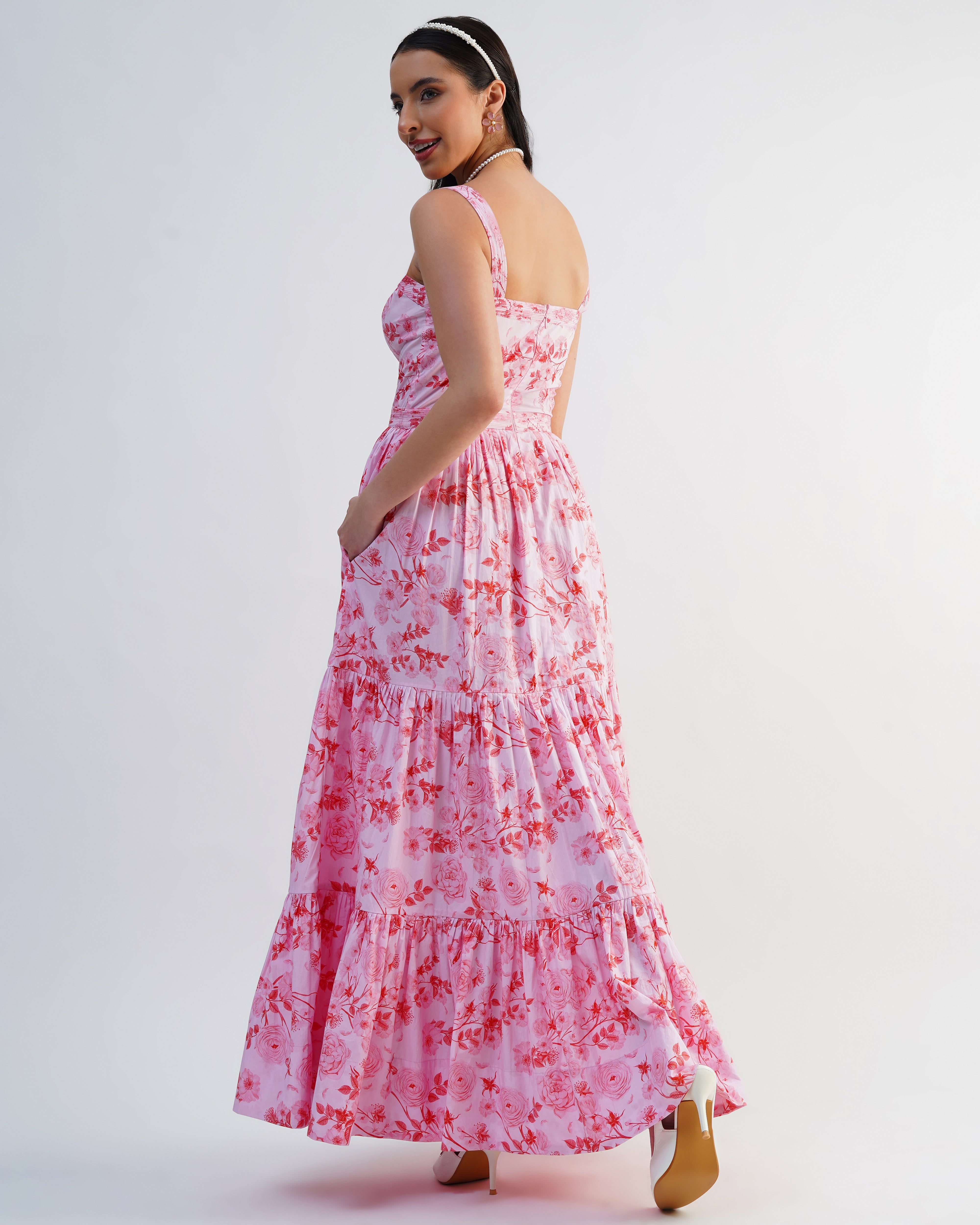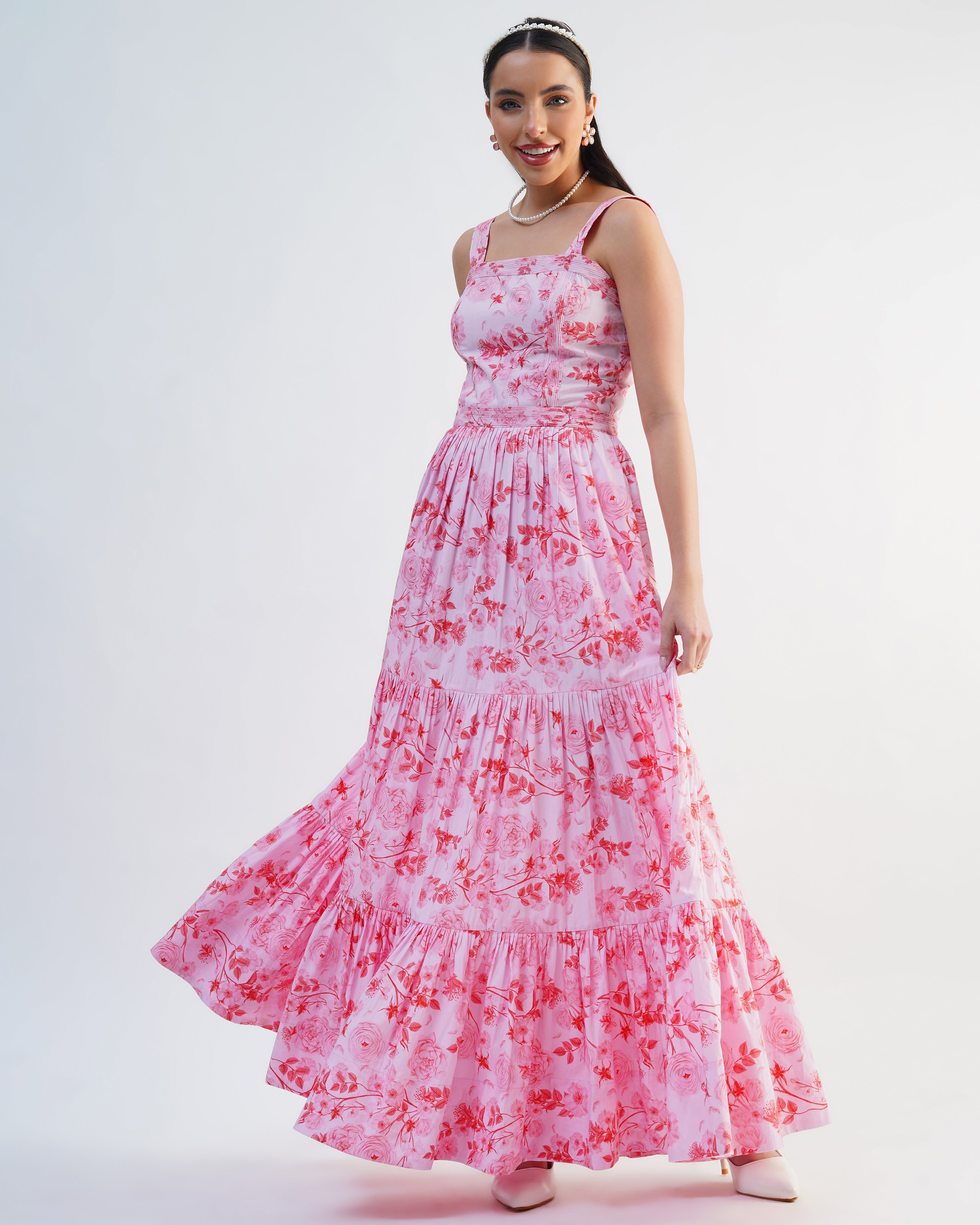 This beautiful maxi dress captures the perfect summer feeling with its vibrant pink floral print. Featuring a fitted bodice and a dramatically full skirt, the light fabric flows beautifully with every step.