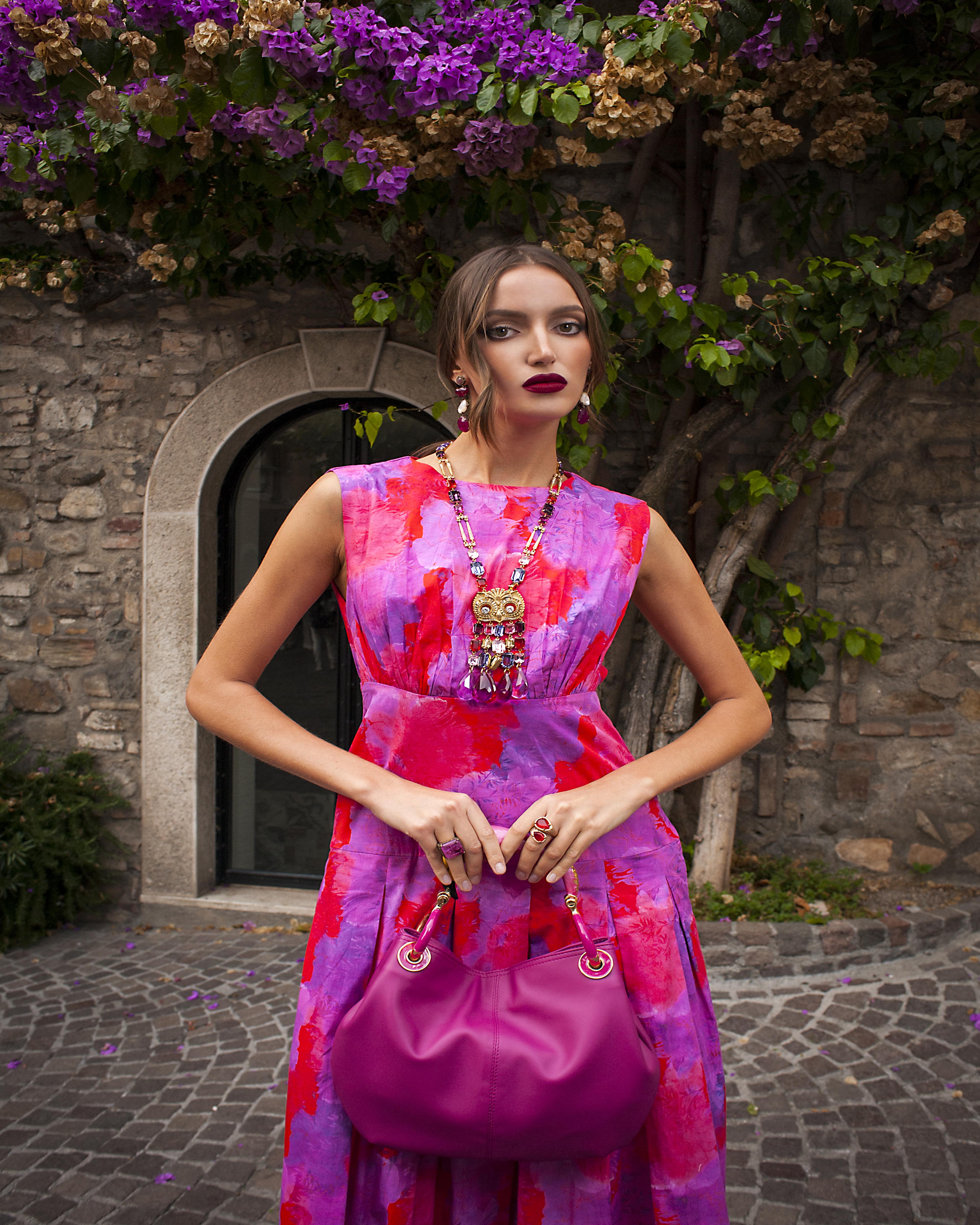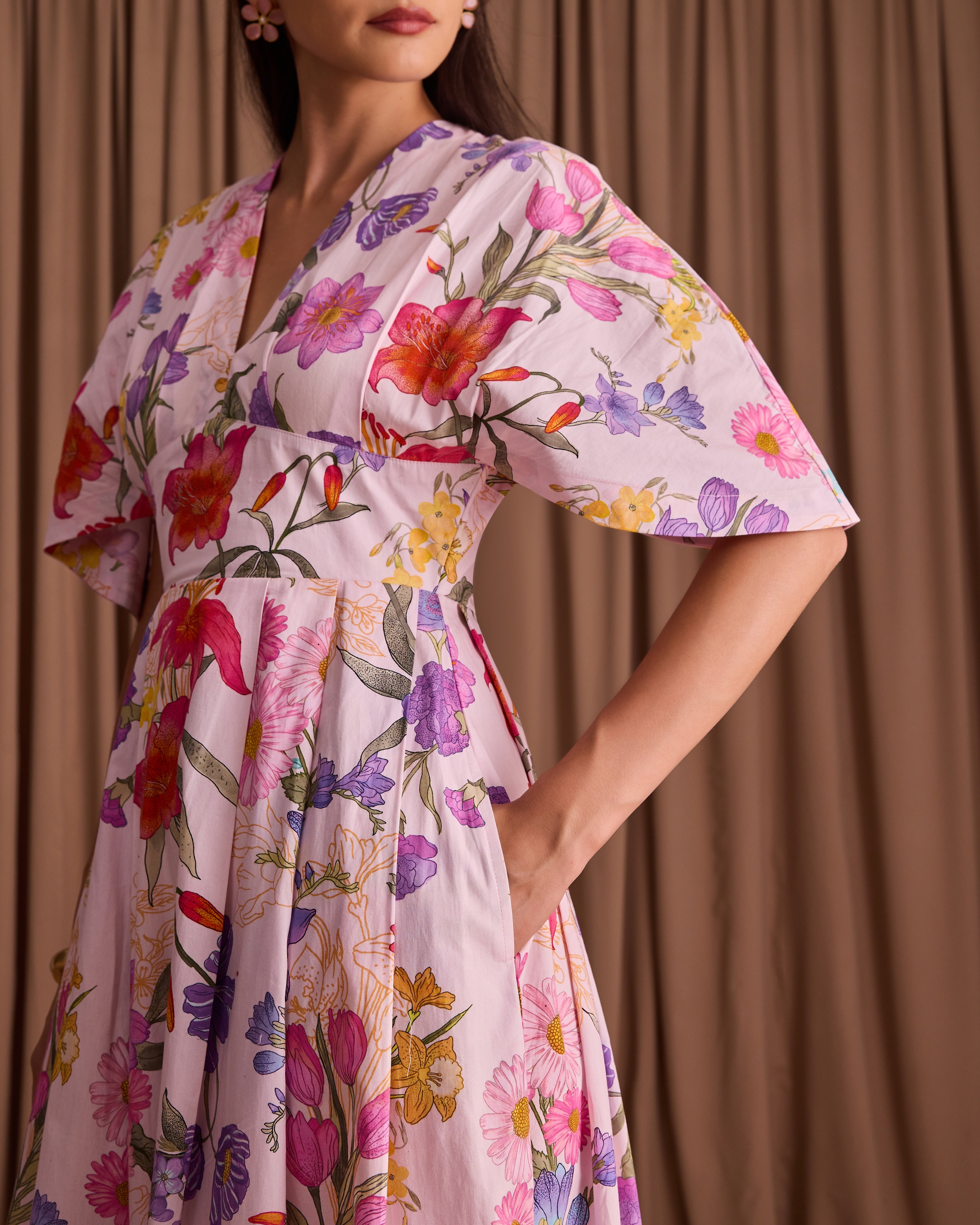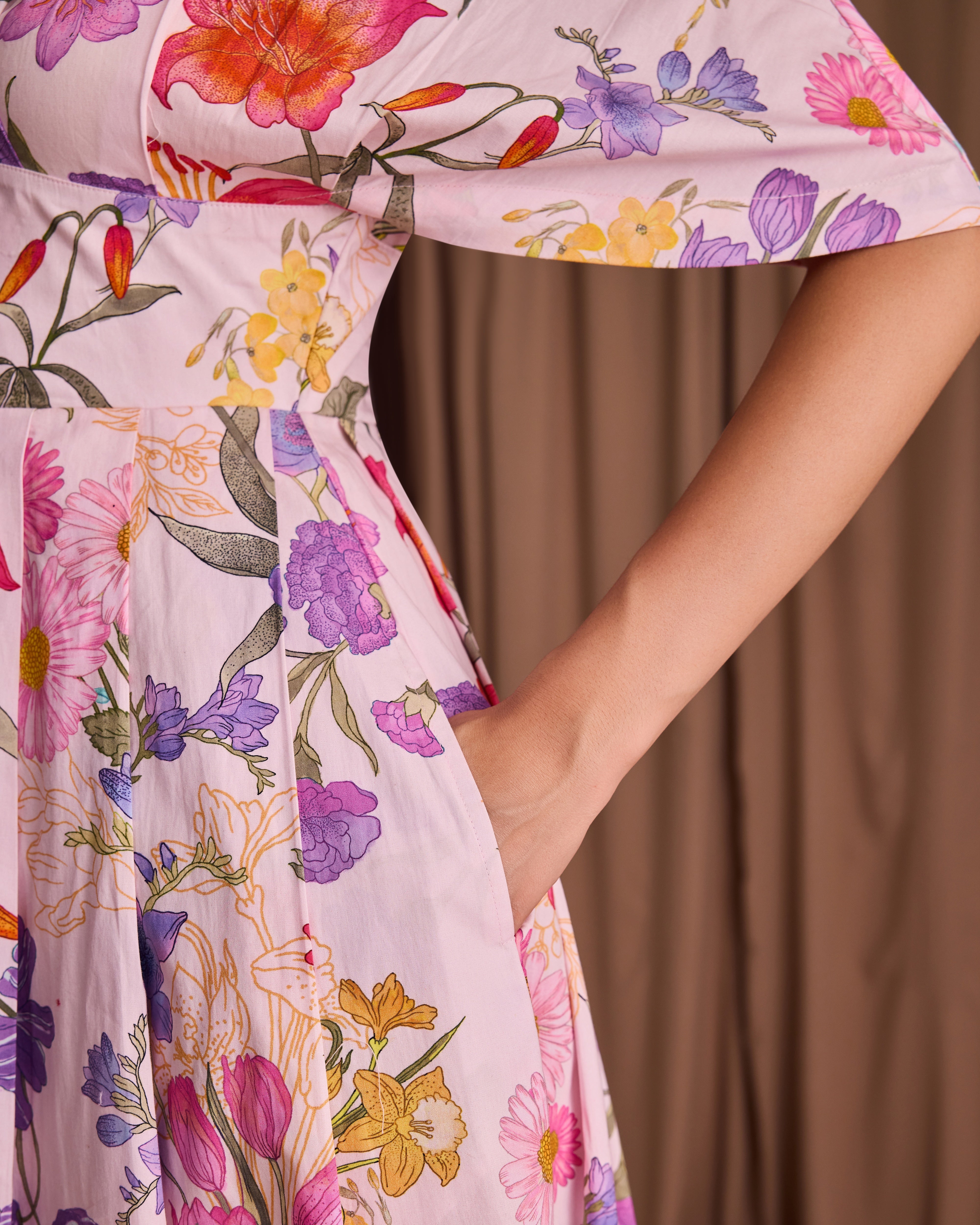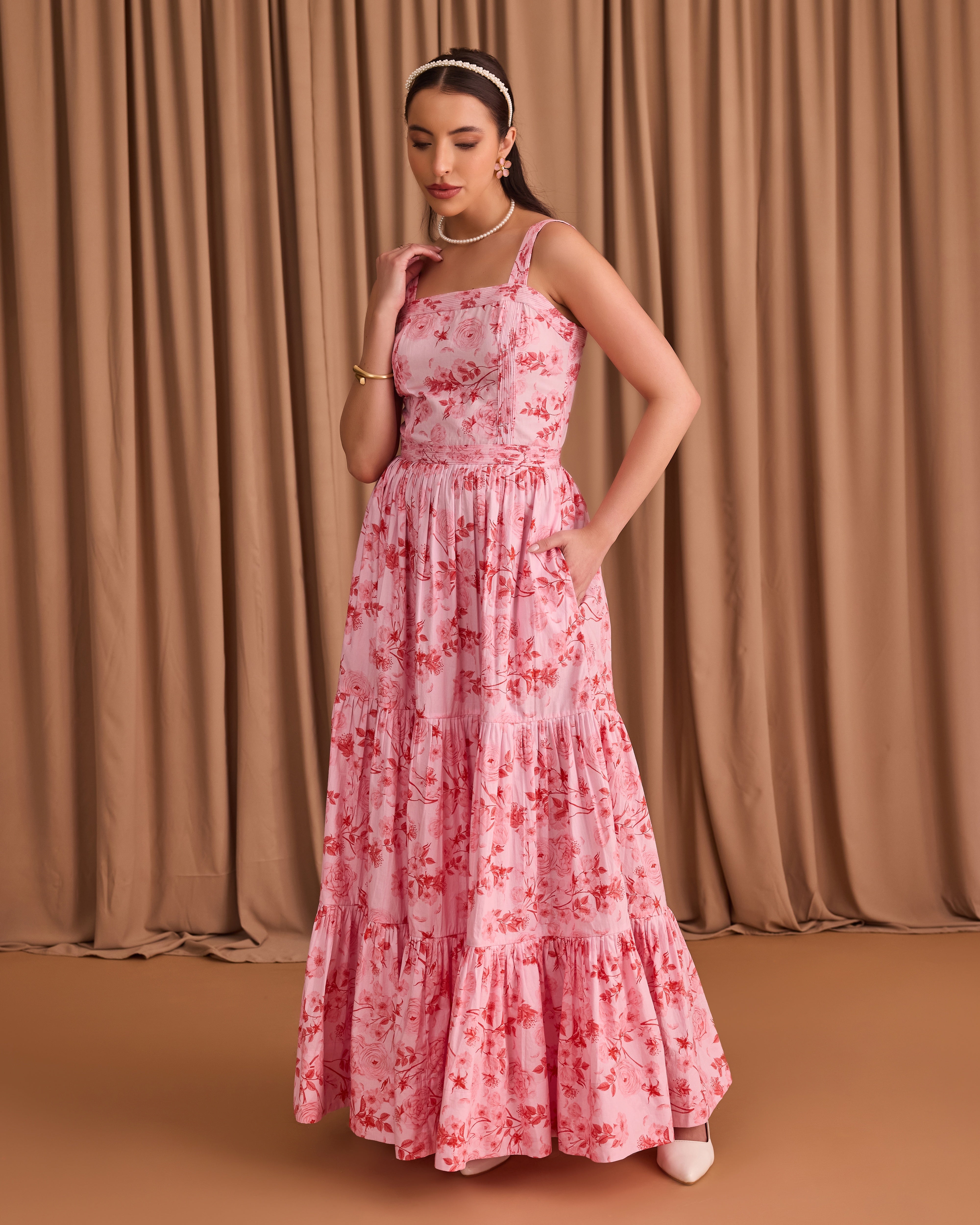 This beautiful maxi dress captures the perfect summer feeling with its vibrant pink floral print. Featuring a fitted bodice and a dramatically full skirt, the light fabric flows beautifully with every step.