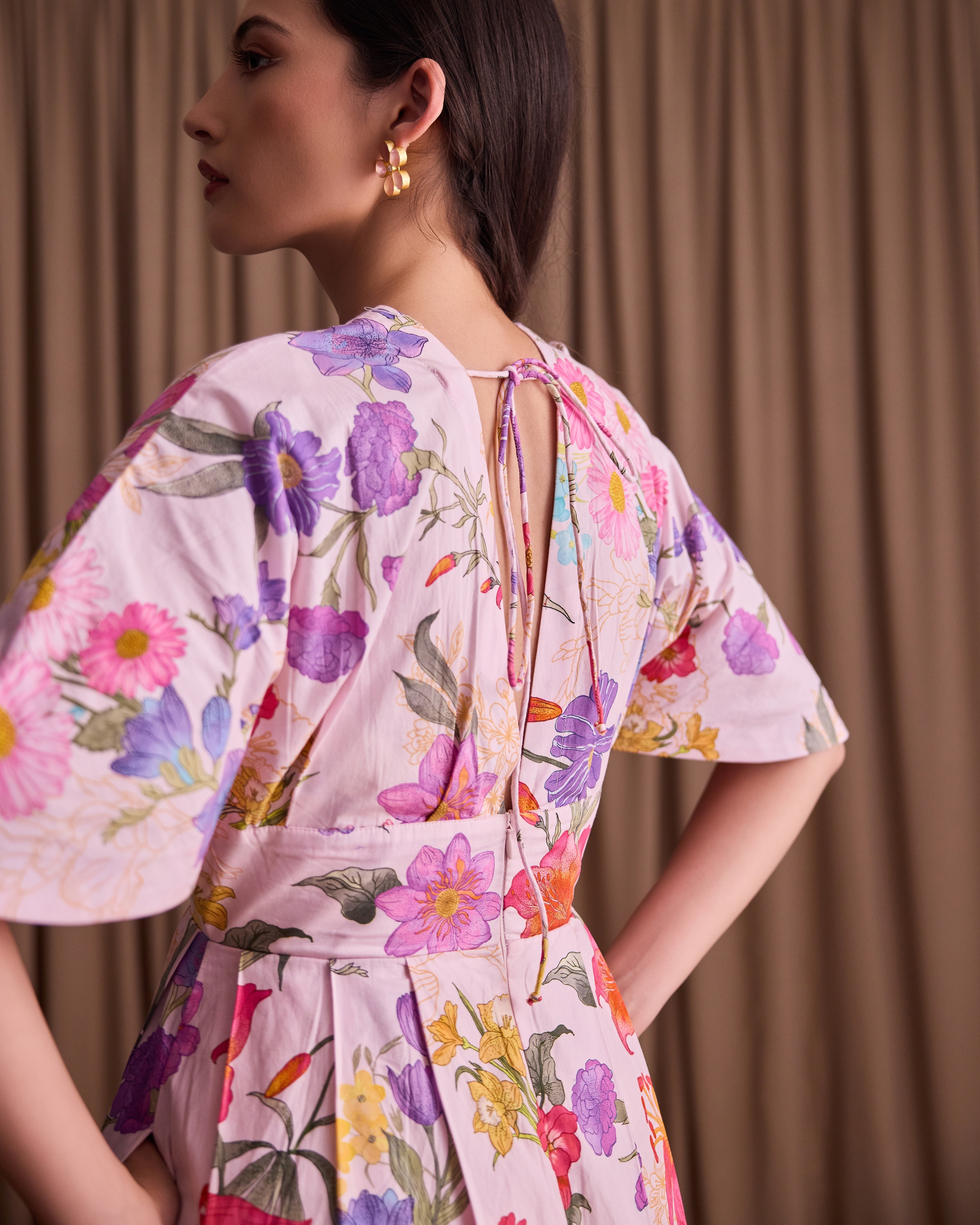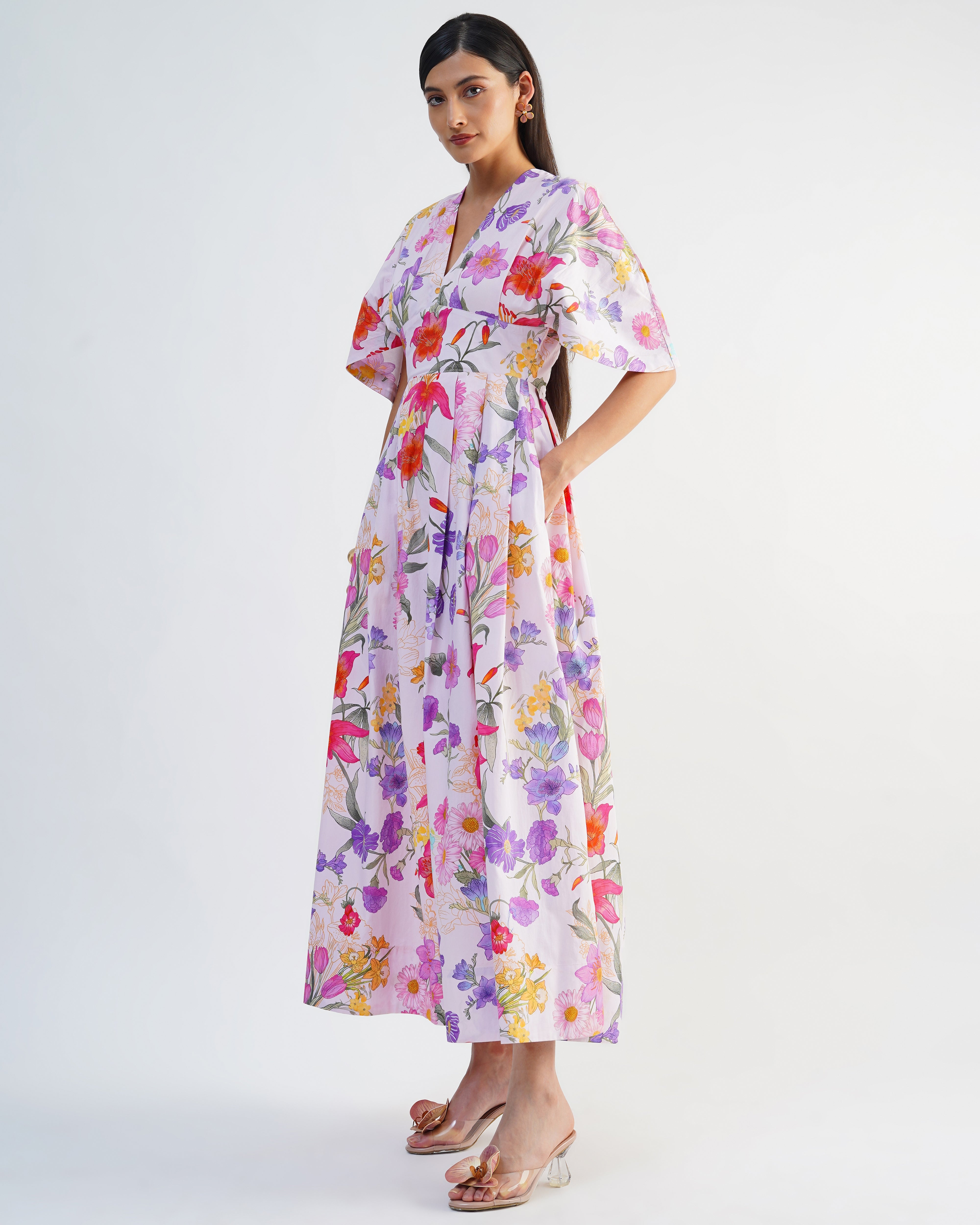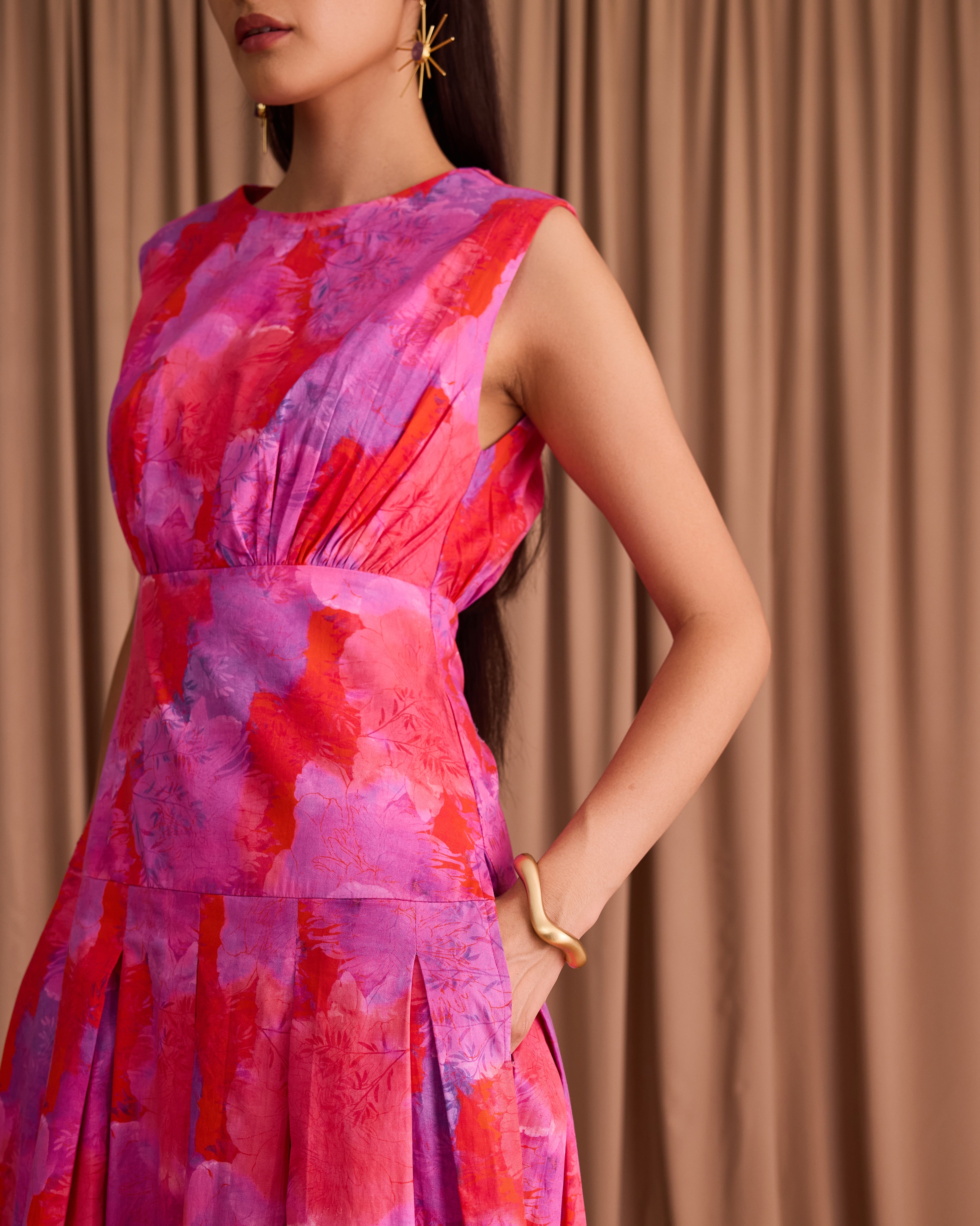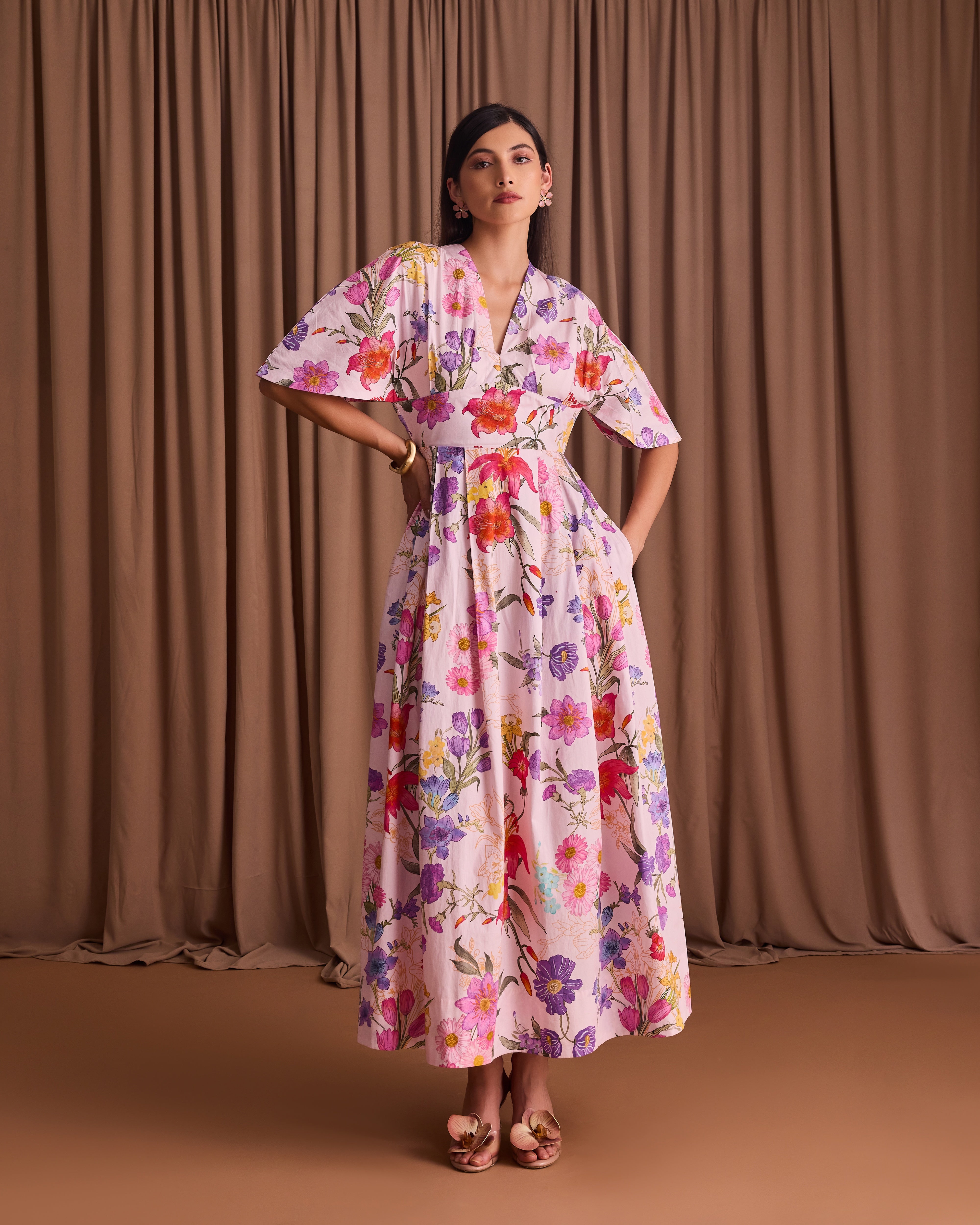 This beautiful maxi dress captures the perfect summer feeling with its vibrant pink floral print. Featuring a fitted bodice and a dramatically full skirt, the light fabric flows beautifully with every step.